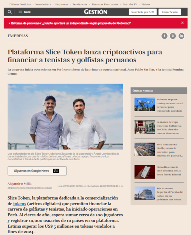 Diario Gestión: Entrevista sobre el lanzamiento de Slice Token en Perú
