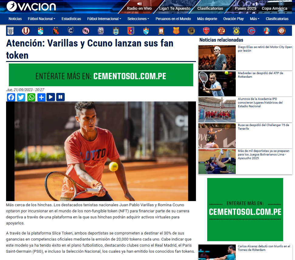 Ovación: Artículo sobre el fichaje de Juan Pablo Varillas y Romina Ccuno en la plataforma y el anuncio del lanzamiento de sus tokens