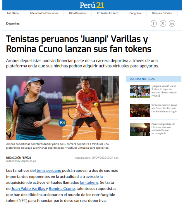 Perú 21: Artículo sobre el fichaje de Juan Pablo Varillas y Romina Ccuno en la plataforma y el anuncio del lanzamiento de sus tokens