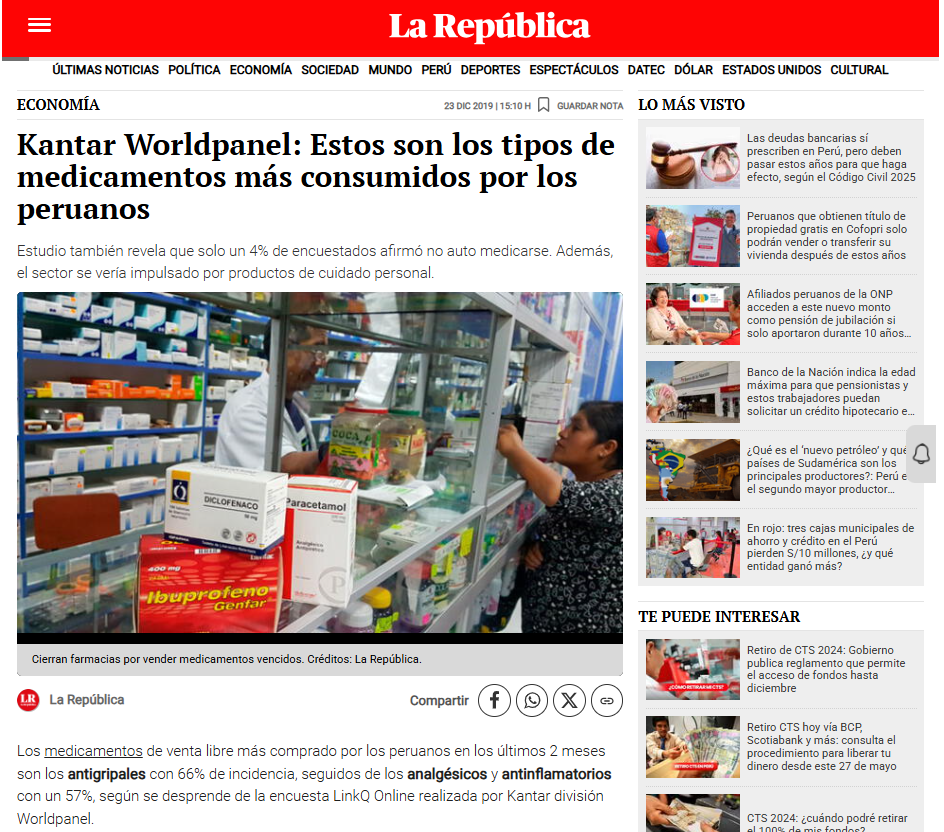 Enlace https://larepublica.pe/economia/2019/12/23/kantar-estos-son-los-tipos-de-medicamentos-mas-consumidos-por-los-peruanos