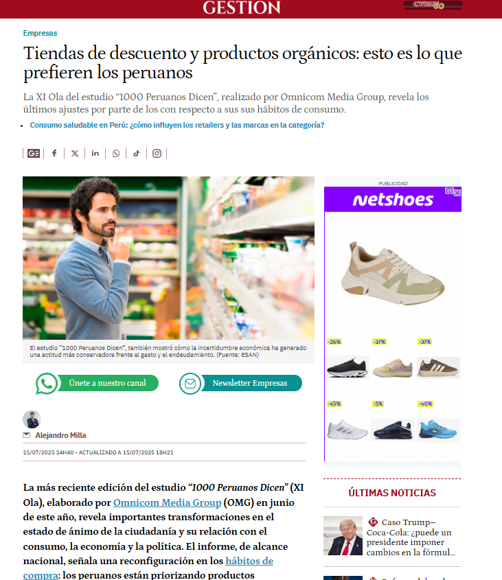 Artículo sobre “1000 Peruanos Dicen” en el medio de negocios Gestión (informe y mención en portada)
