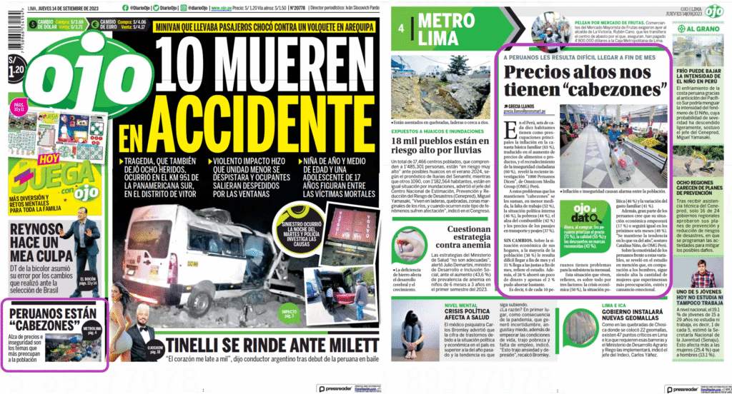 Artículo sobre “1000 Peruanos Dicen” en el diario peruano OJO (informe principal y mención en portada)
