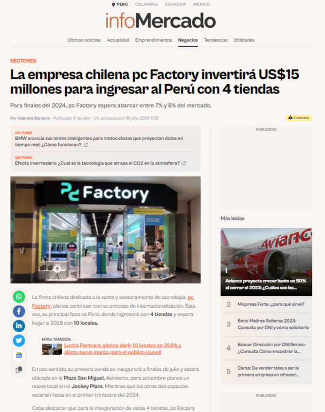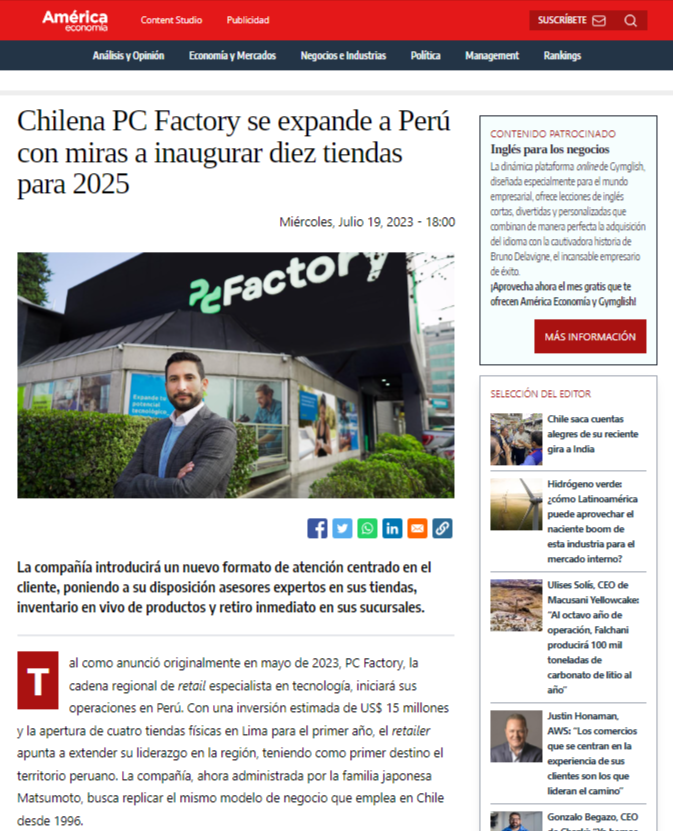 América Economía: Artículo sobre el lanzamiento de pc Factory en Perú en este medio latinoamericano