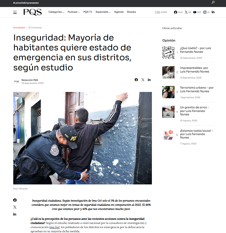 El relanzamiento de ImaGo y la difusión de su estudio “La Seguridad Ciudadana en Perú” consolidaron a la empresa como referente en opinión pública y análisis social en el mercado peruano. La estrategia de PR fortaleció su reputación, amplió su alcance mediático y le otorgó un lugar de liderazgo en la conversación sobre seguridad ciudadana, garantizando un posicionamiento sostenido en medios de comunicación y entre líderes de opinión.